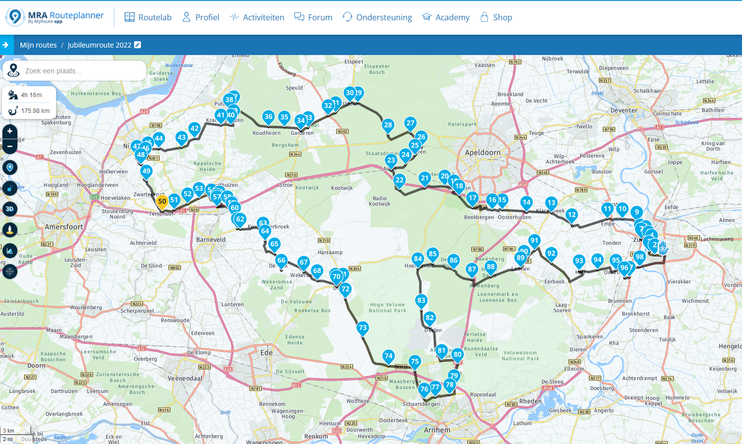 Deel 1 van de rit is ongeveer 84 km.